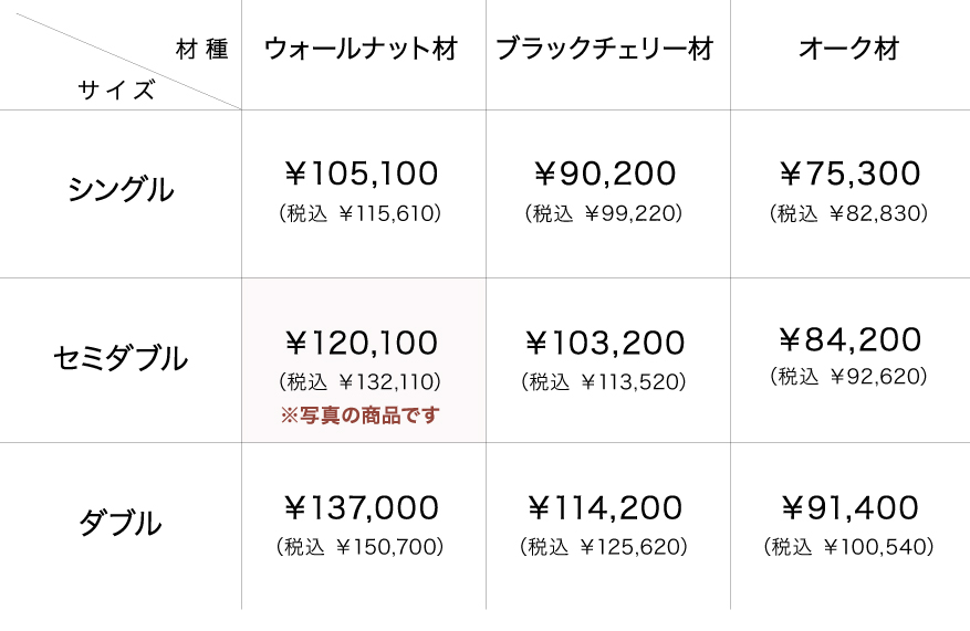 | 金 額 | ウォールナット材 【シングル】 115,610円(税込価格)〜 105,100円(本体価格)〜 【セミダブル】 132,110円(税込価格)〜 120,100円(本体価格)〜 【ダブル】 150,700円(税込価格)〜 137,000円(本体価格)〜 ブラックチェリー材 【シングル】 99,220円(税込価格)〜 90,200円(本体価格)〜 【セミダブル】 113,520円(税込価格)〜 103,200円(本体価格)〜 【ダブル】 114,200円(税込価格)〜 114,200円(本体価格)〜 オーク材 【シングル】 82,830円(税込価格)〜 75,300円(本体価格)〜 【セミダブル】 92,620円(税込価格)〜 84,200円(本体価格)〜 【ダブル】 100,540円(税込価格)〜 91,400円(本体価格)〜 ※写真の商品は「【ウォールナット材】」です。 |