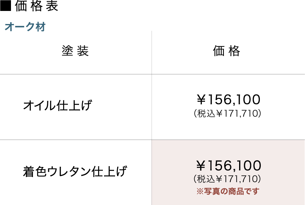 | 塗 装 | 着色ウレタン仕上げ ※2種類からお選びいただけます。 オイル仕上げ・着色ウレタン仕上げ |
