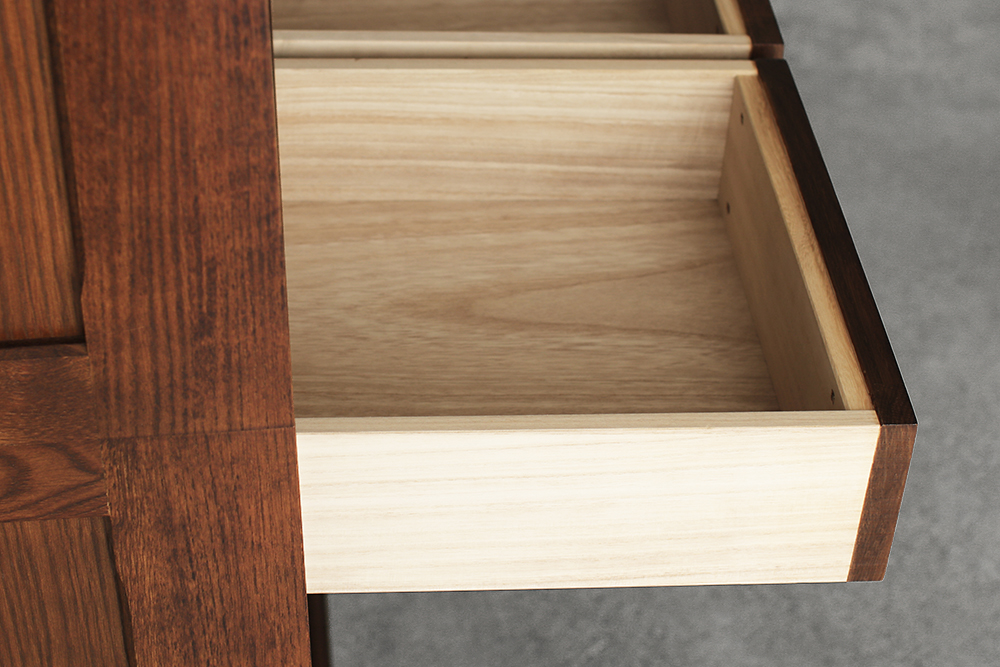 側面は枠組みの框(かまち)を緻密に組み上げどこから見ても隙がない上品な仕上がりが魅力の水屋タンスです。