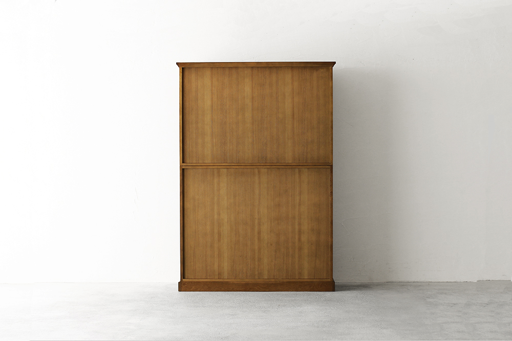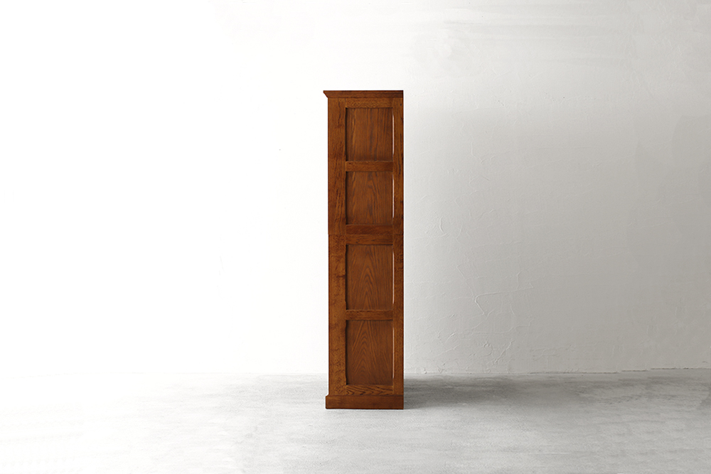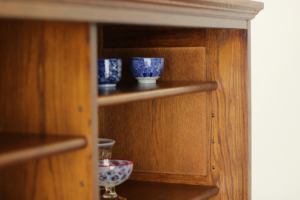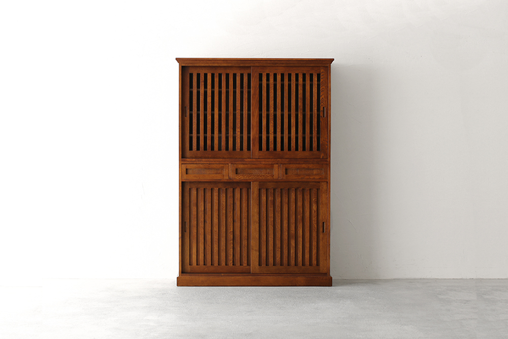 格子・引き出しの前板にはオークの無垢材を使用し、アンティーク風のブラウン色で仕上げをしています。使い勝手の良い引き戸と繊細な格子を組み合わせ古風な雰囲気ですが、洗練された佇まいは和の空間だけでなく洋の空間にもすんなりと溶け込みます。