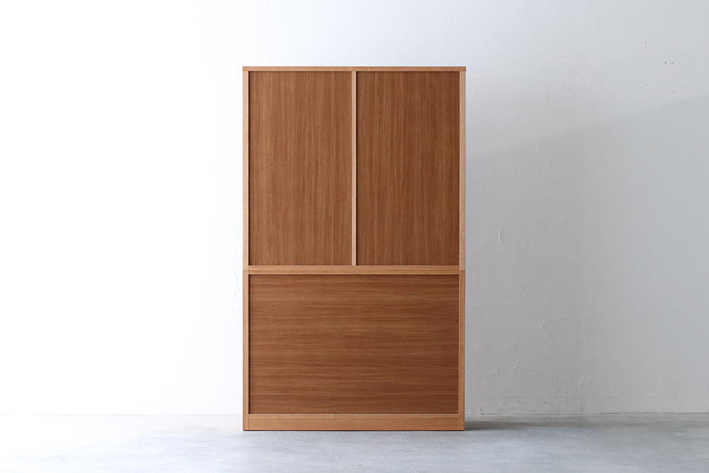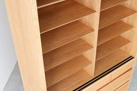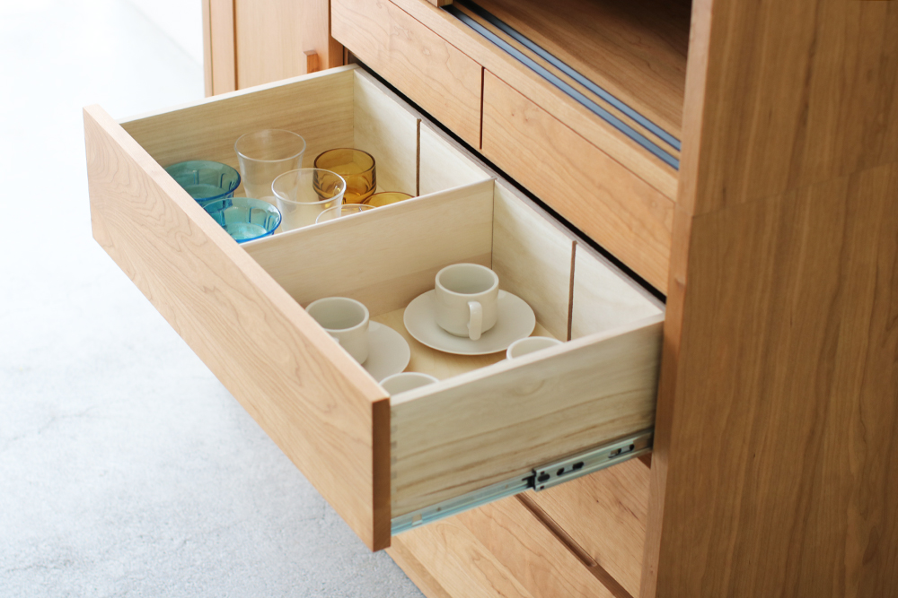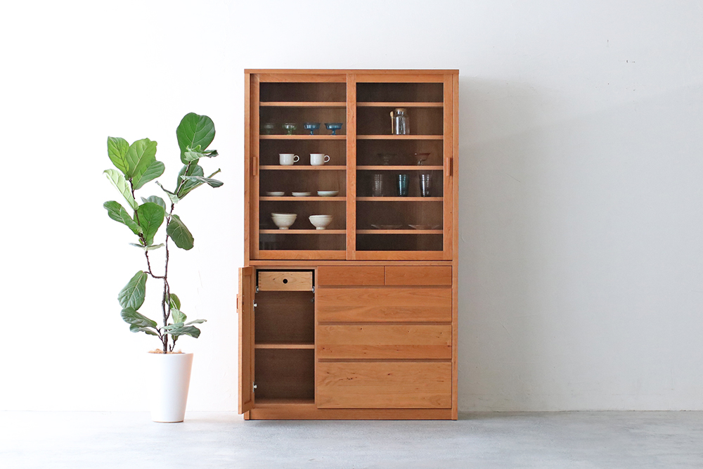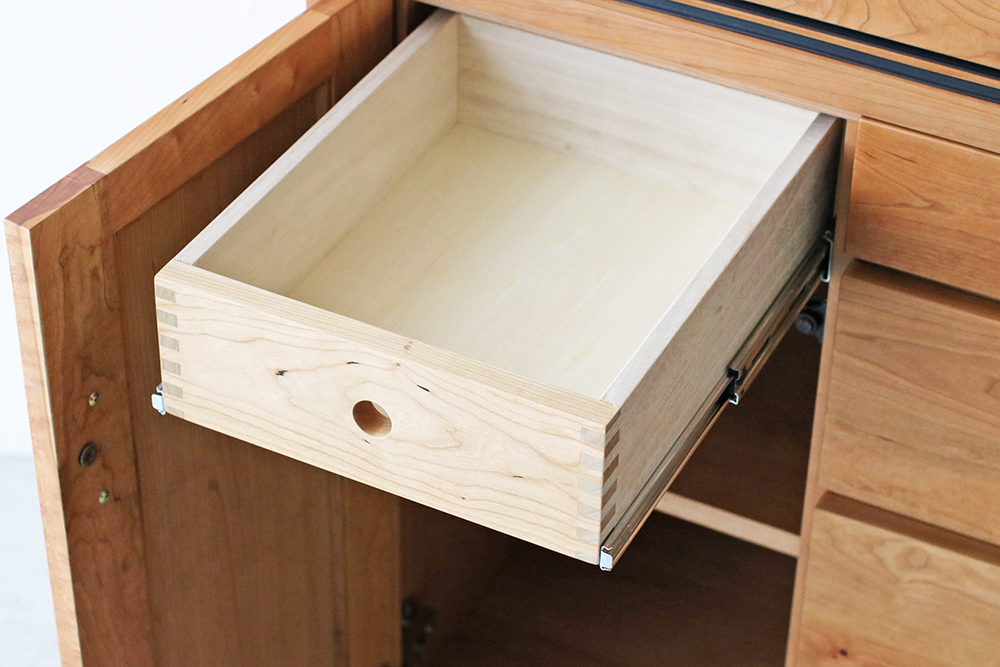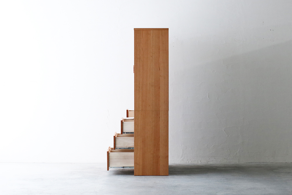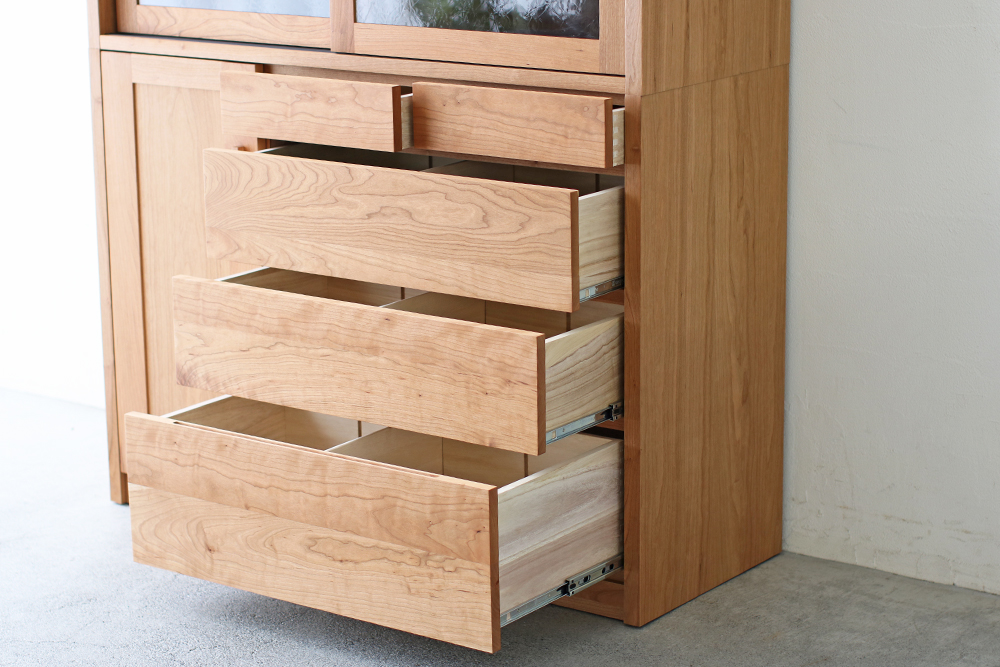 | 仕 様 | 前板:ブラックチェリー無垢材 側板:ブラックチェリー突板材 引き出し内部:桐材 引き戸:透明ガラス |