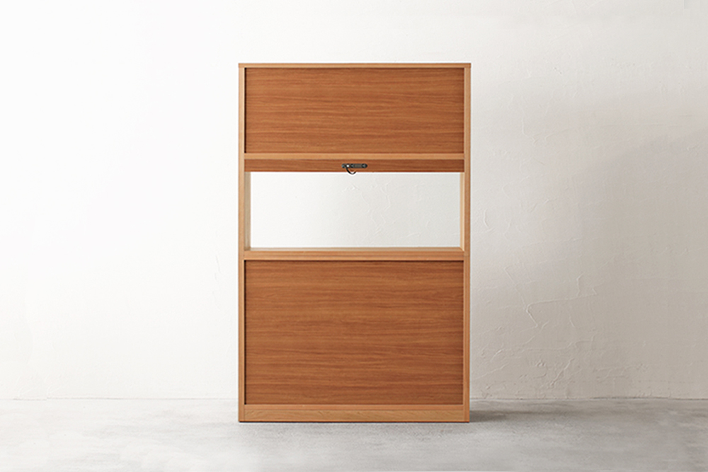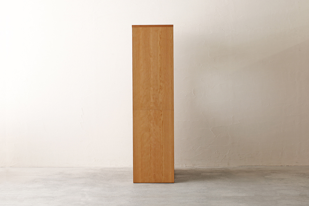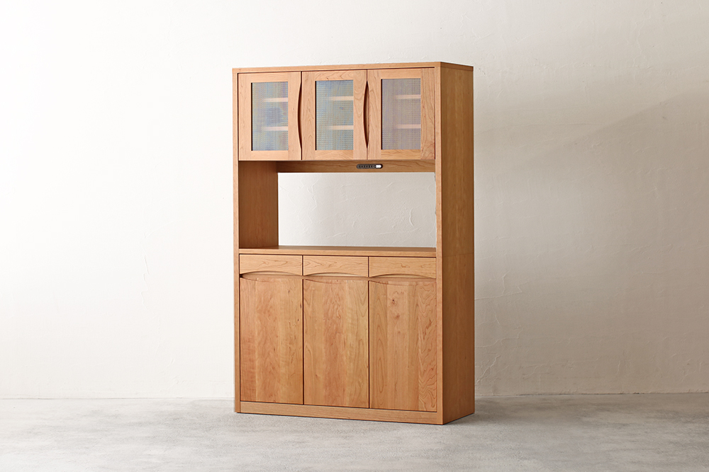| 仕 様 | 前板:ブラックチェリー無垢材 側板・カウンター天板:ブラックチェリー突板材 オープンスペース上部:モイス(吸湿素材) 引き出し内部:桐材 ガラス:透明ガラス |
