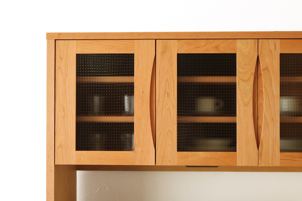 弓形に削り込まれた手掛けとガラスの開き戸が、空間を柔らかな印象にしてくれます。前板に節ありの無垢材を使用しており、無垢の木目や色合いを楽しんでいただけます。