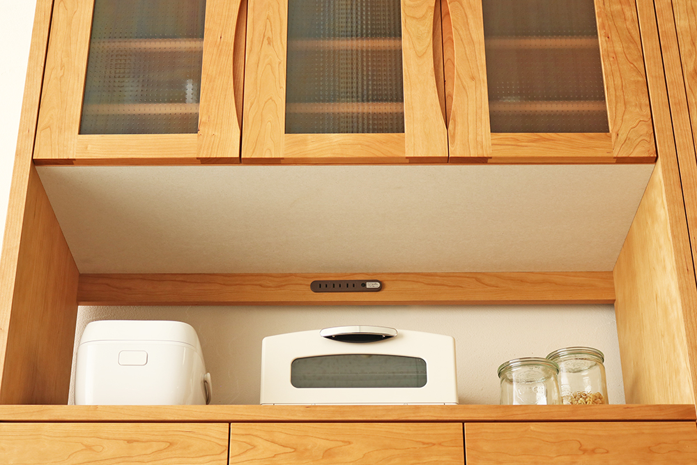 オープン部の天井には吸湿素材のモイスを使用しています。天然素材で構成された吸湿素材で、調湿機能に優れており蒸気の出るオーブンや炊飯器、電気ポットを置くことができます。上部中央に3口コンセントが装着されていますので便利です。