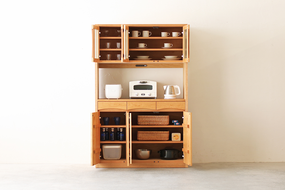 可動棚は上棚4枚、下棚4枚の合計8枚。大皿や背の高いグラスもたっぷりと収納できます。3杯の引き出しは桐材の蟻組工法で作られており、強度も保たれています。ストッパーが付いているので抜け落ちることもありません。
