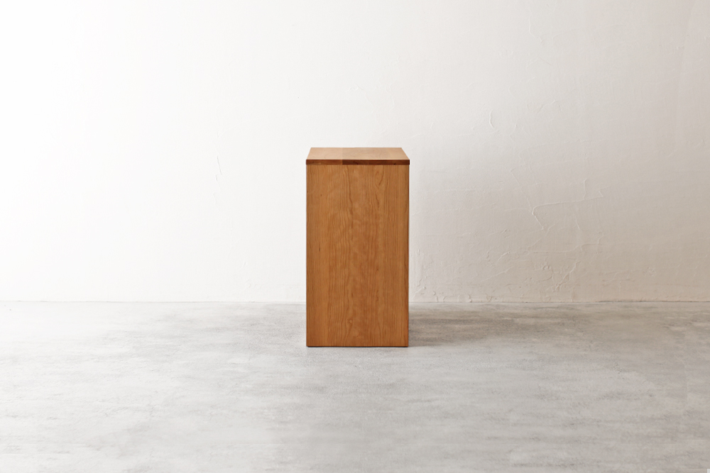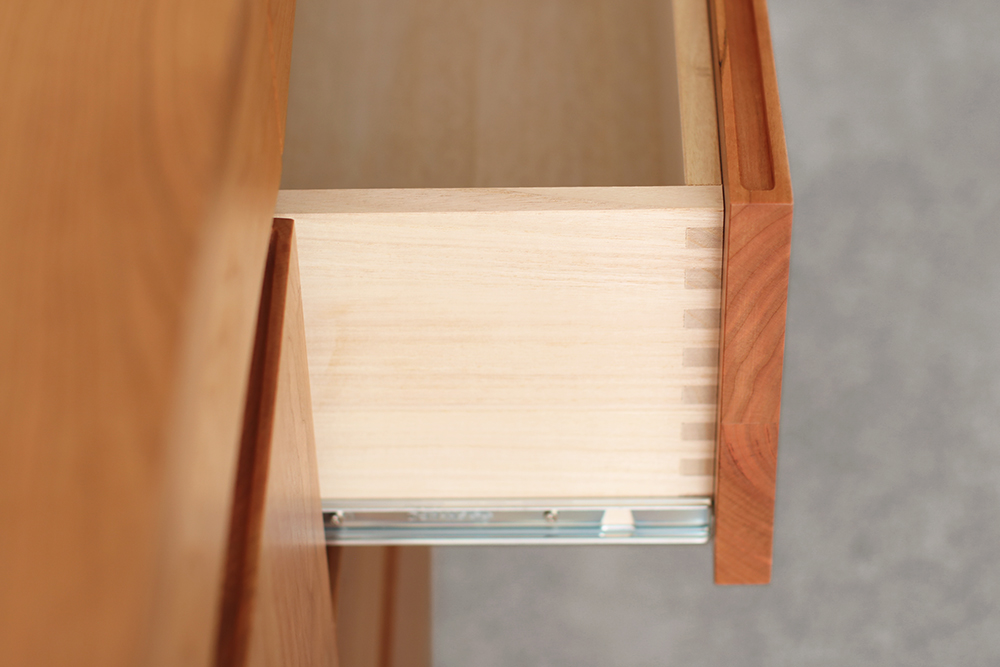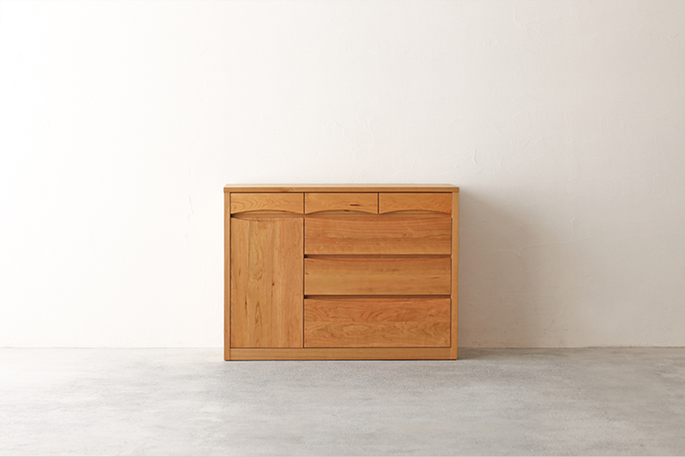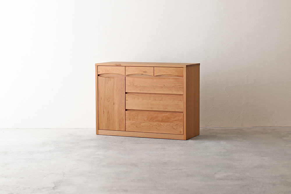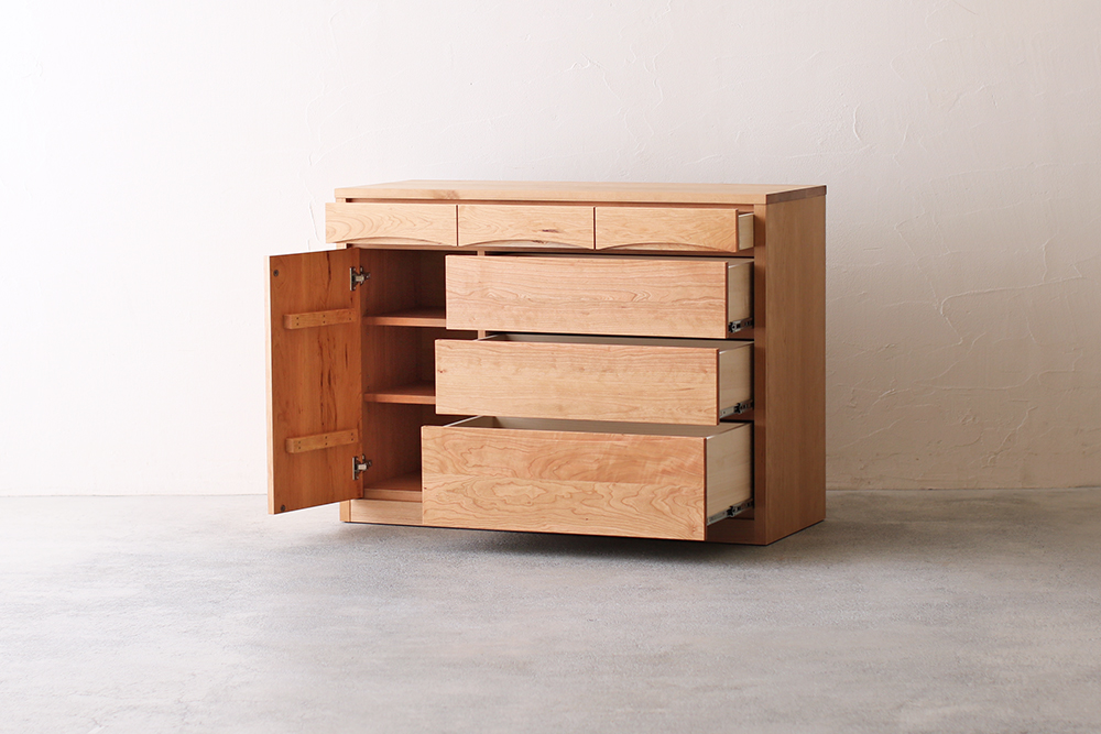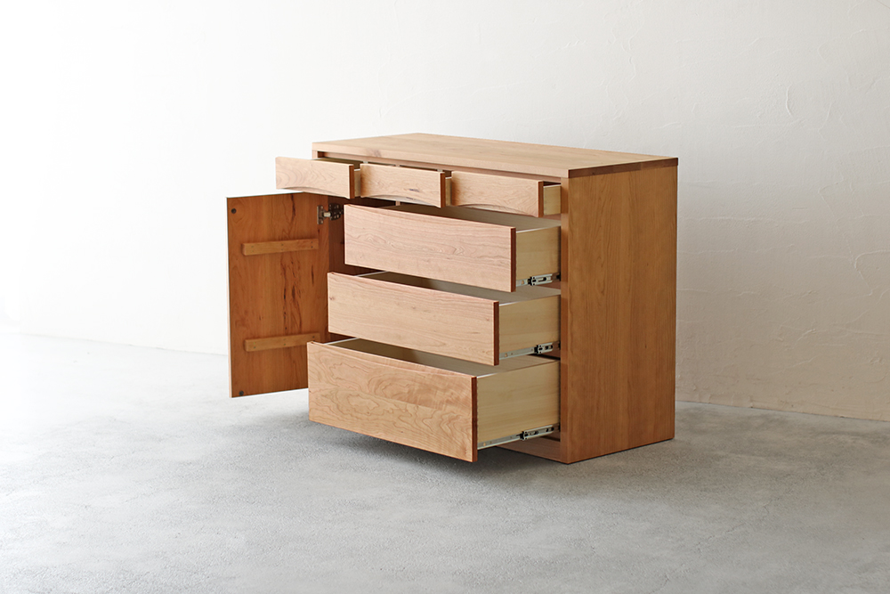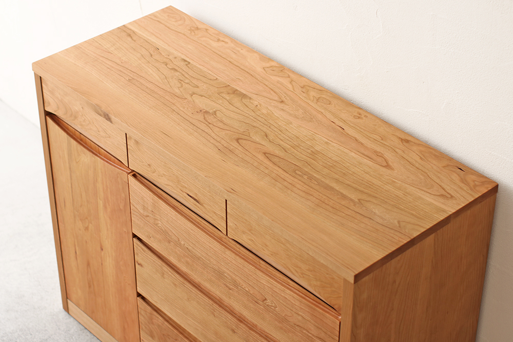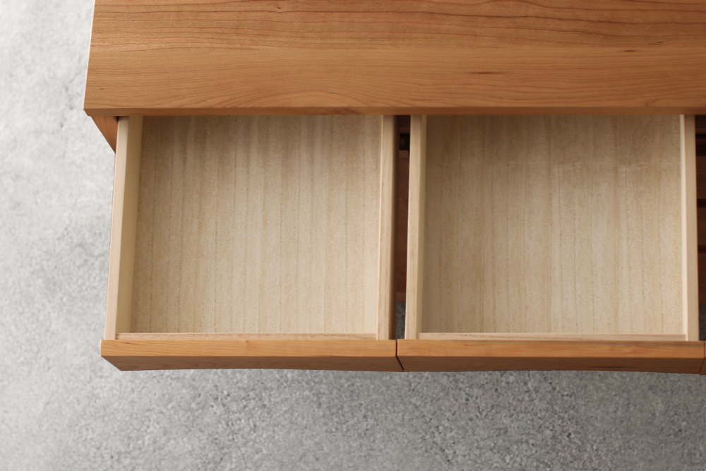 | 仕 様 | 天板・前板:ブラックチェリー無垢材 側板:ブラックチェリー突板材 引き出し内部:桐材 |