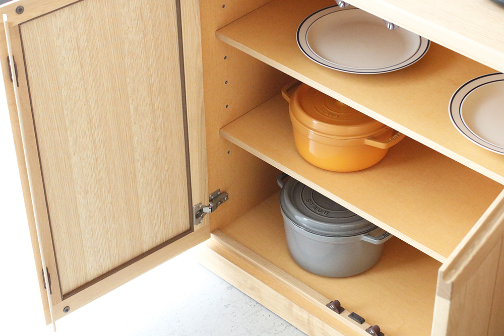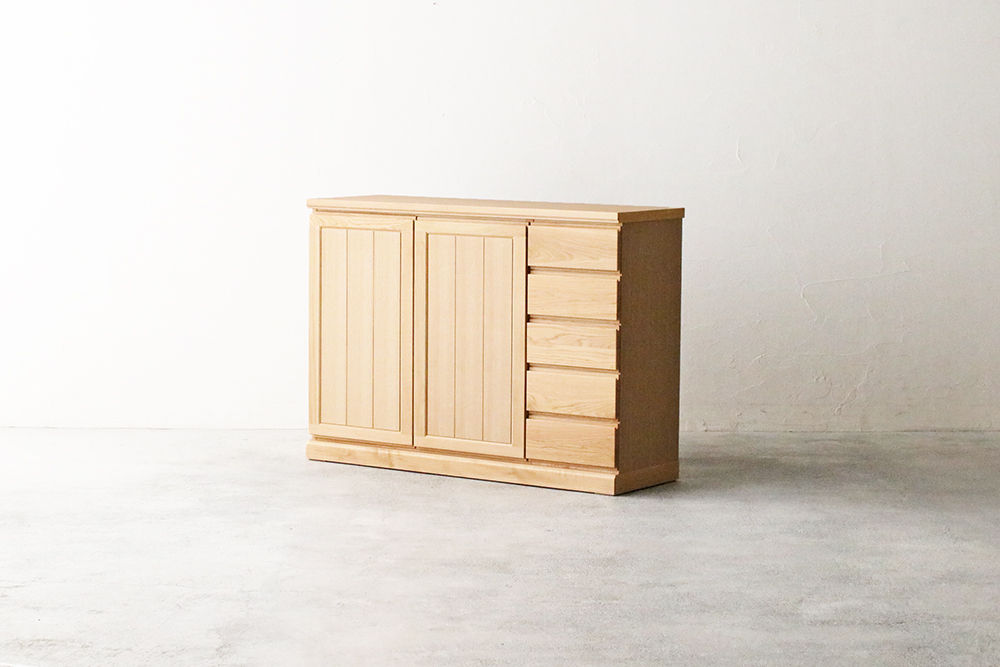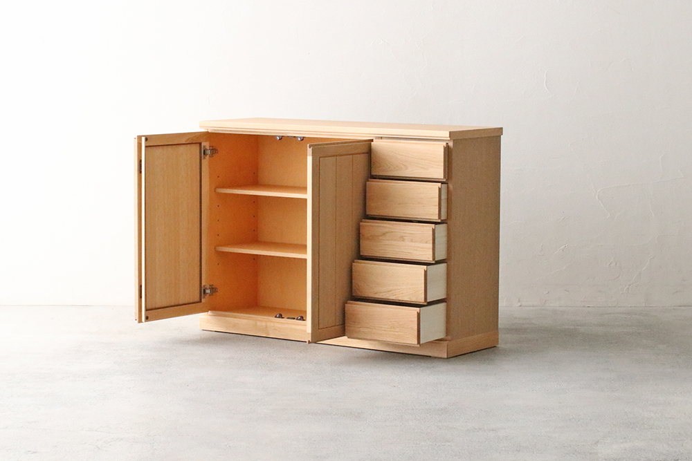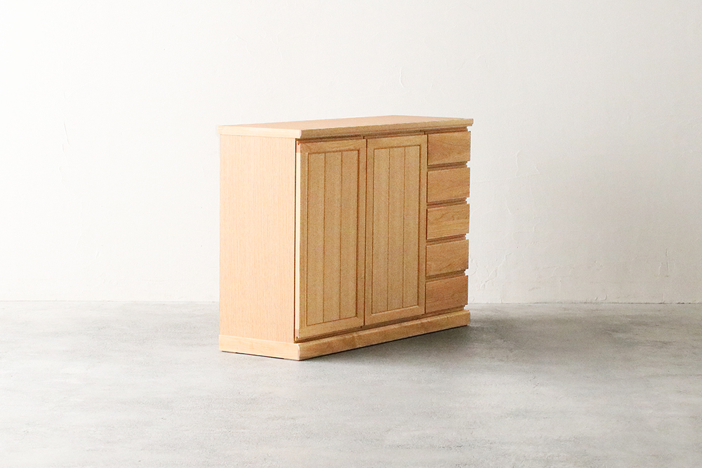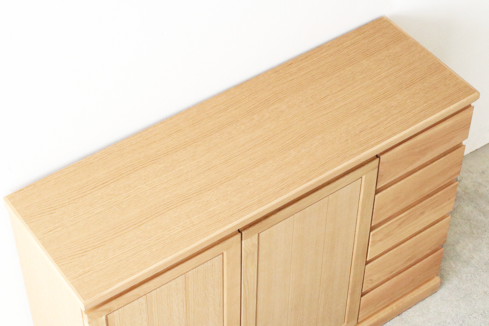 | 仕 様 | 前板:オーク無垢材・突板材(裏側) 天板・側板:オーク突板材 引き出し内部:桐材・突板材 |