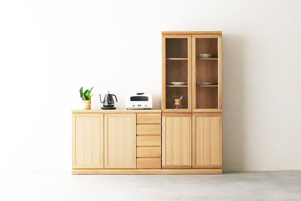引き出し内寸:1〜5段目 W27×D31.5×H11.5(cm) 開き戸内寸:W82×D31×H76(cm) 棚板:W82×D29(cm)2枚 ※幅は77cm・120cm・153cmの3種類からお選びいただけます。 |