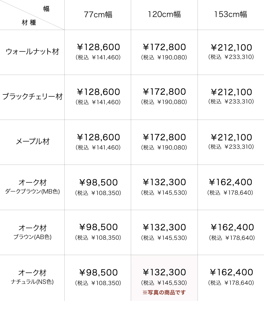 樹種はウォールナット材・ブラックチェリー材・メープル材・オーク材(ウレタン着色3色)の6種類から、サイズは幅77cm・120cm・153cmの3種類からお好みに合わせてお選びいただけます。