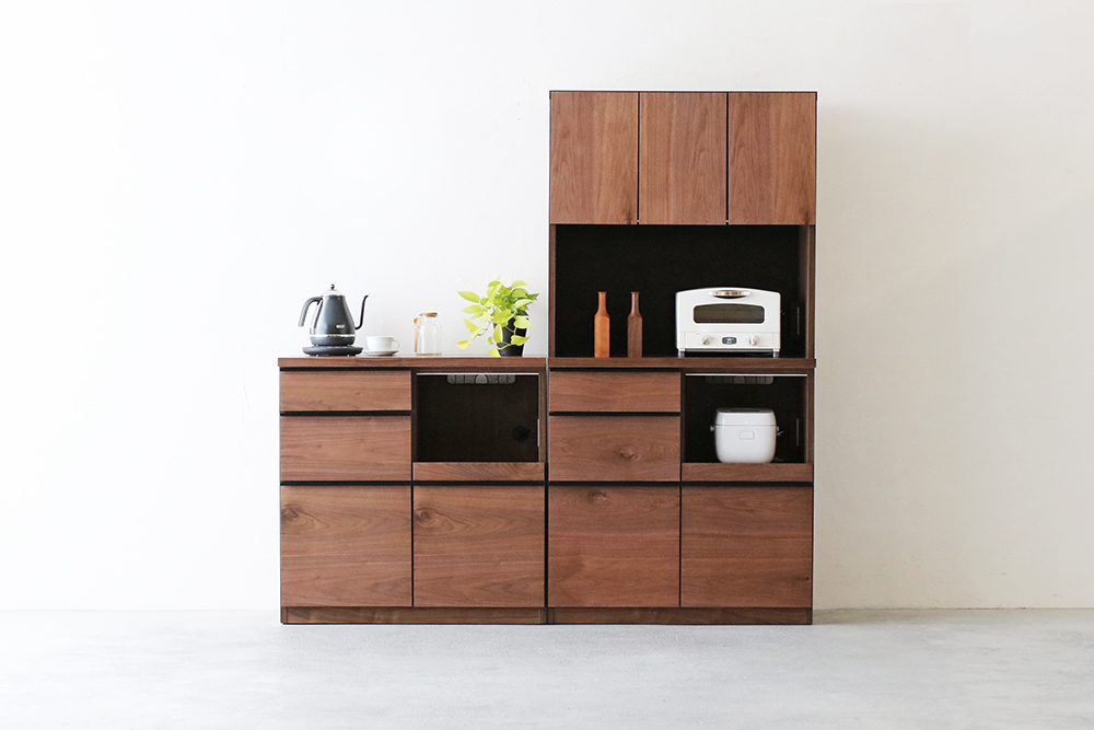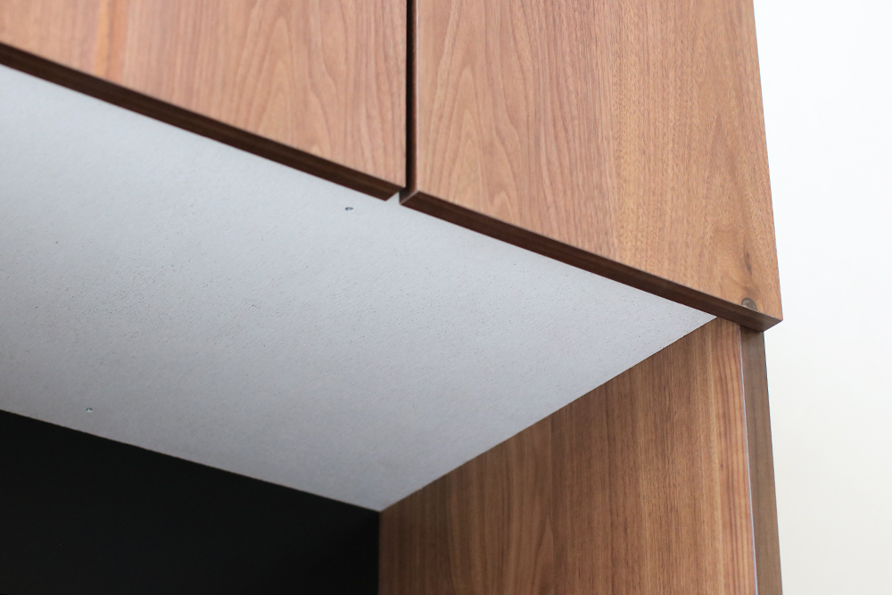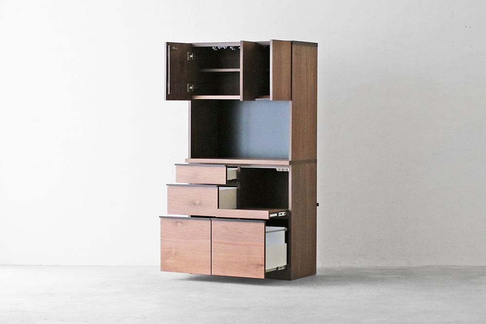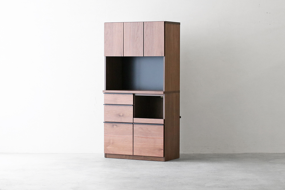 | 仕 様 | 前板・側板・カウンター天板:ウォールナット突板材 オープンスペース上部:モイス(吸湿素材) 引き出し内部:化粧板 取っ手:スチール |