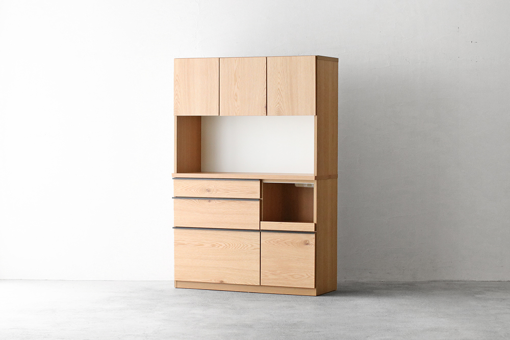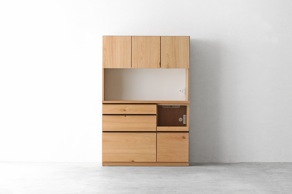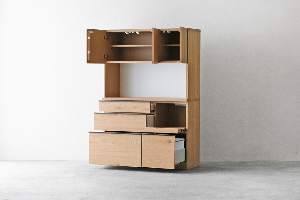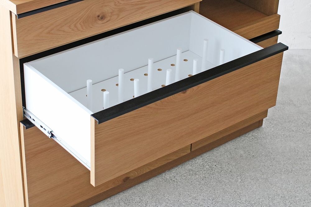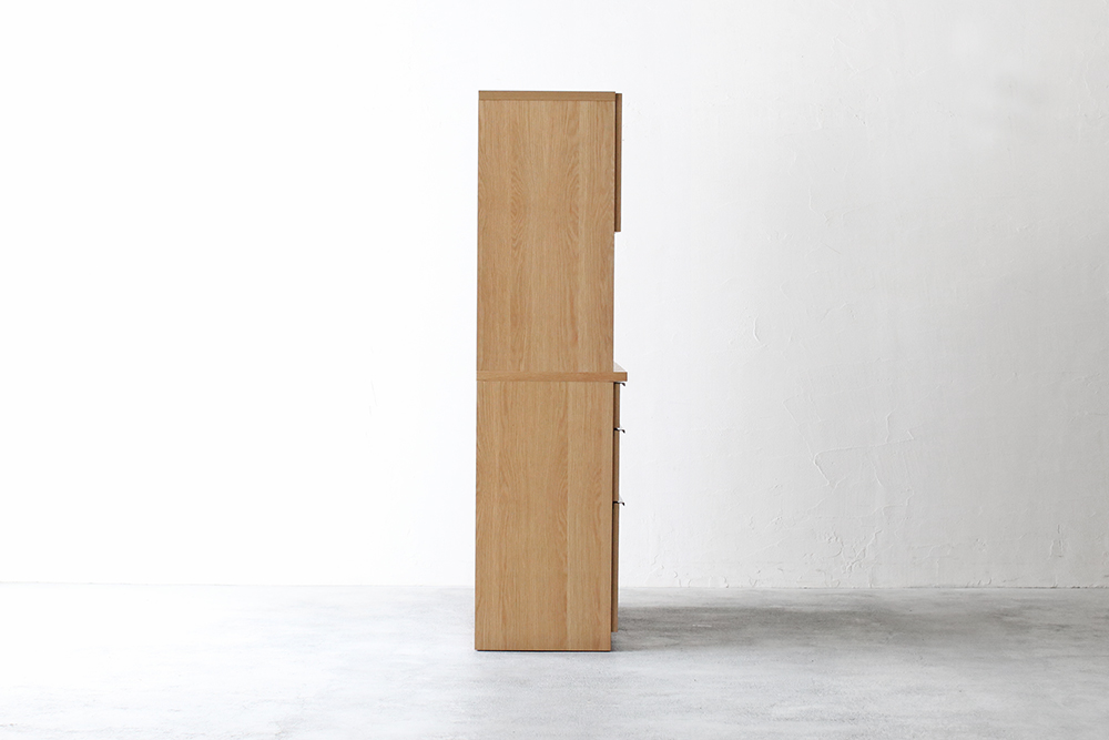| 仕 様 | 前板・側板・カウンター天板:オーク突板材 オープンスペース上部:モイス(吸湿素材) 引き出し内部:化粧板 取っ手:スチール |