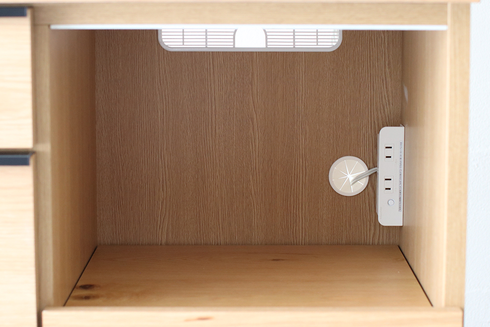 オープンスペース上部とスライドトレー上部には吸湿素材のモイスを使用しています。天然素材で構成された吸湿素材で、調湿機能に優れており蒸気の出るオーブンや炊飯器、電気ポットを置くことができます。オープンスペースとスライドトレー背面にはそれぞれ2口コンセントが装着されていますので、背面でコード処理が楽にでき便利ですます。