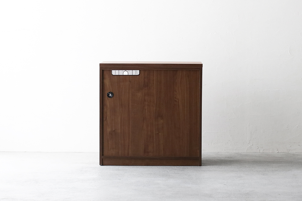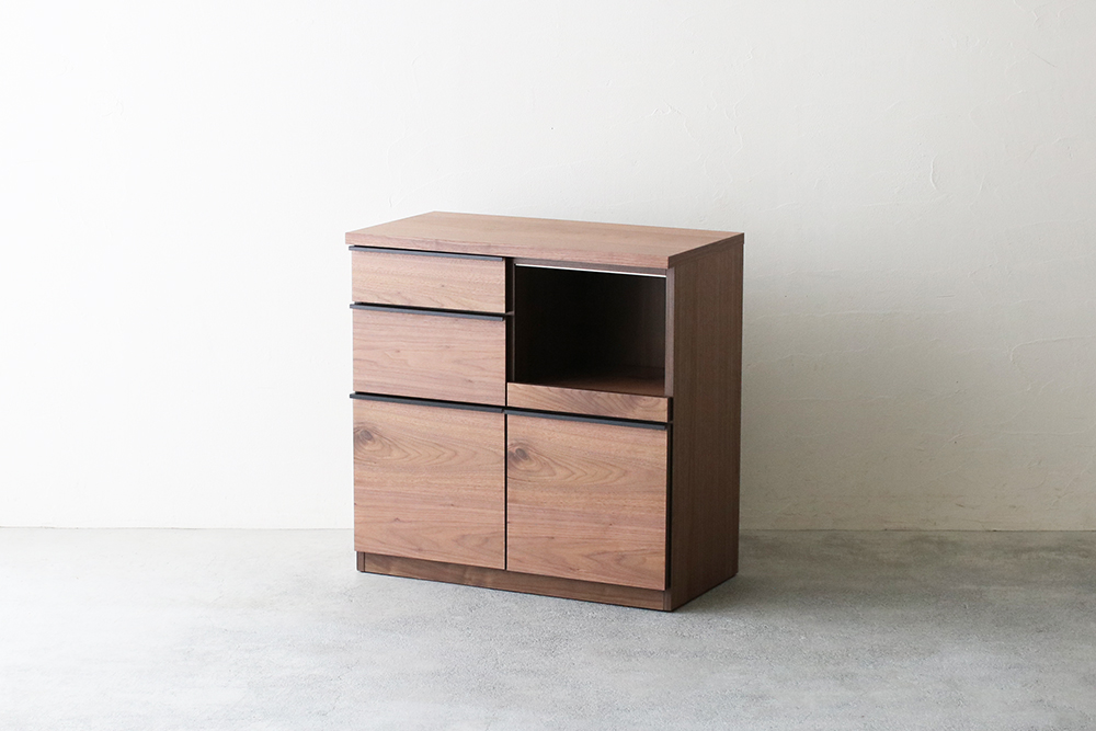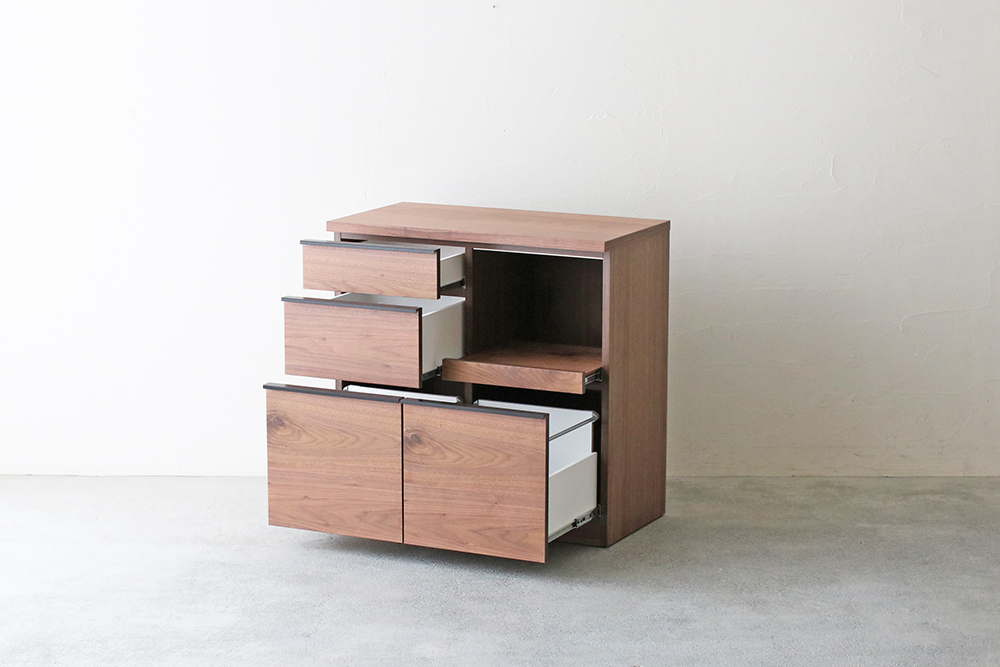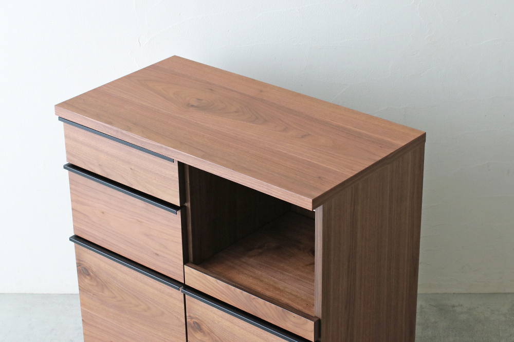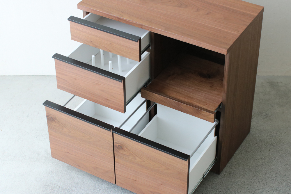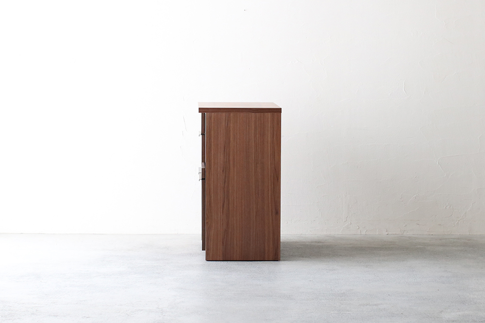 | 仕 様 | 天板・前板・側板:ウォールナット突板材 スライドトレー上部:モイス(吸湿素材) 引き出し内部:化粧板 取っ手:スチール |