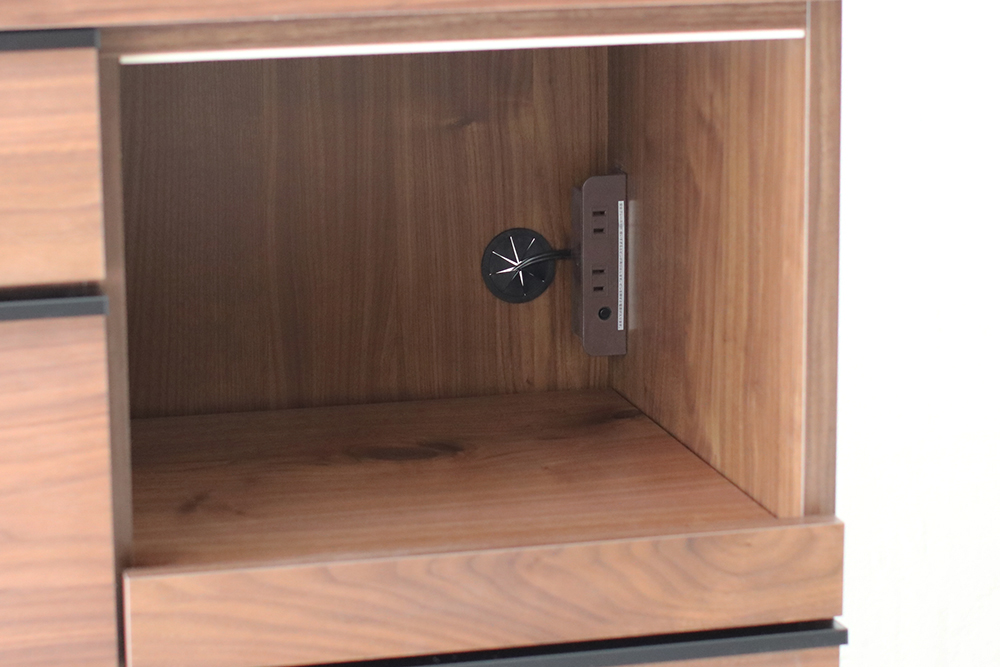 スライドトレー上部には吸湿素材のモイスを使用しています。天然素材で構成された吸湿素材で、調湿機能に優れており蒸気の出る炊飯器、電気ポットを置くことができます。背面に2口コンセントが装着されていますので便利です。2段目引き出しのディッシュスタンドは取り外しができます。