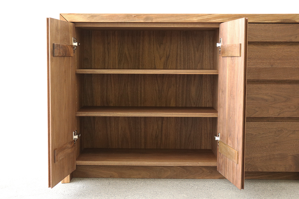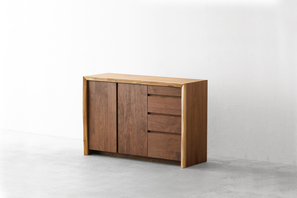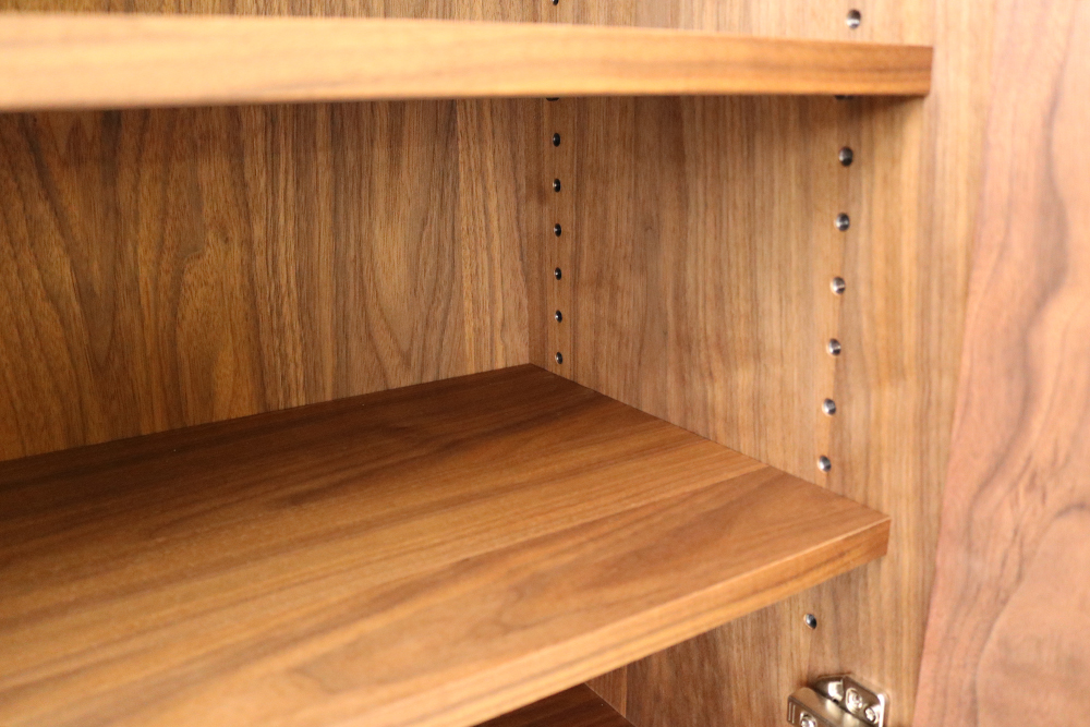 開き戸には高さ調整が可能な可動棚が2枚あり、収納力に優れています。無垢材をふんだんに使い、 木材の耳部分は迫力がありまるで天然木が家の中にあるようです。重厚感と流れるような木目がお部屋の中でも目を引きますよ。