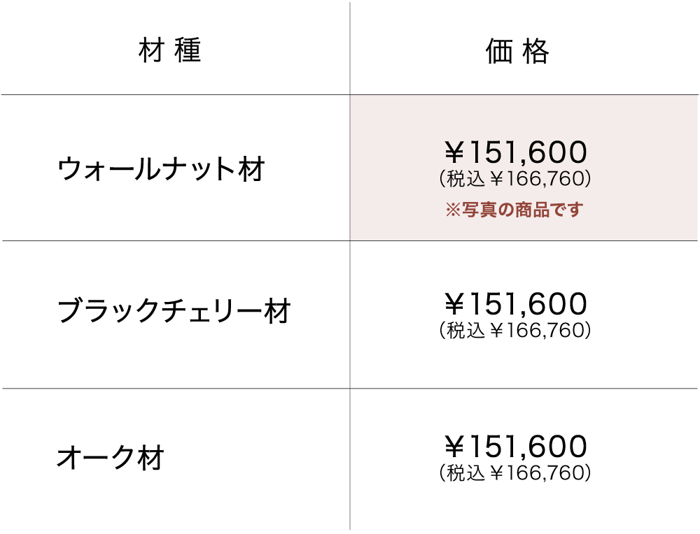 | 素 材 | ウォールナット材 引き出し内部:桐材 ※3種類からお選びいただけます。 ウォールナット材・ブラックチェリー材・オーク材 |