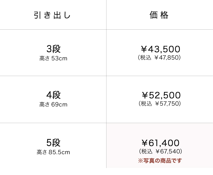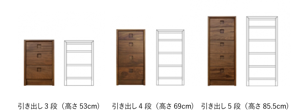 サイズは引き出し3段(高さ53cm)・引き出し4段(高さ69cm)・引き出し5段(高さ85.5cm)の3種類からお好みに合わせてお選びいただけます。