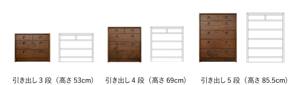 サイズは引き出し3段(高さ53cm)・引き出し4段(高さ69cm)・引き出し5段(高さ85.5cm)の3種類からお好みに合わせてお選びいただけます。