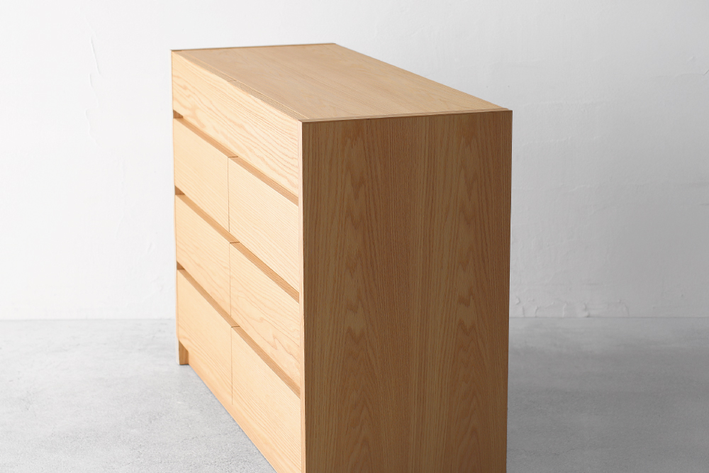 日常使いに合うように、ナチュラル色の明るい印象のオーク材を本体に採用。引き出しは前板と内部に無垢材を使用しているため、木目に重厚感と美しさがあります。